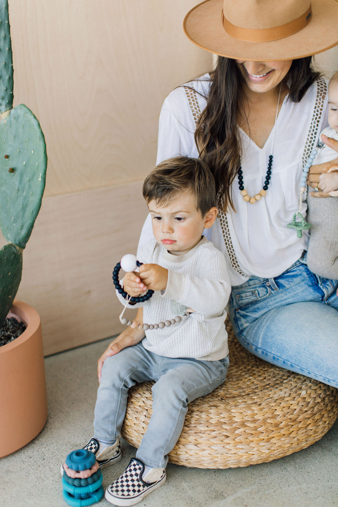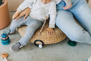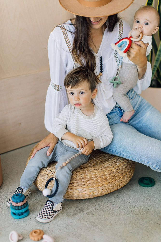 Chewable Charm pacifier clips are simple and the perfect accessory. Tie any type of pacifier or teether/ toy through the loop and stop playing the pick up off the floor game every 2 minutes! They are lovely + practical and can double as teethers, but always require adult supervision.
