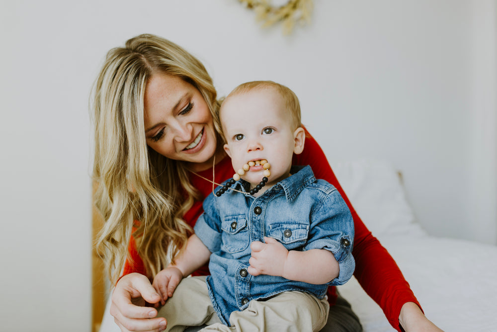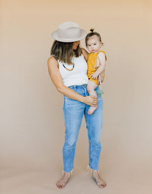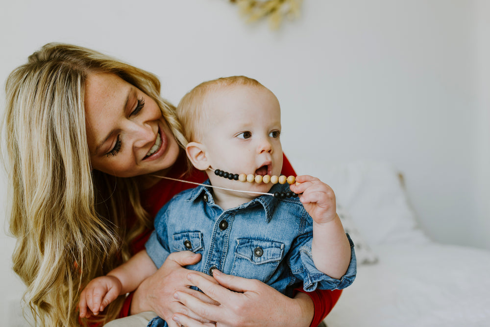 Knox's charm is a stylish and simple color combo and pretty wooden geometric beads, this one will have you and your little babe saying yes, please!